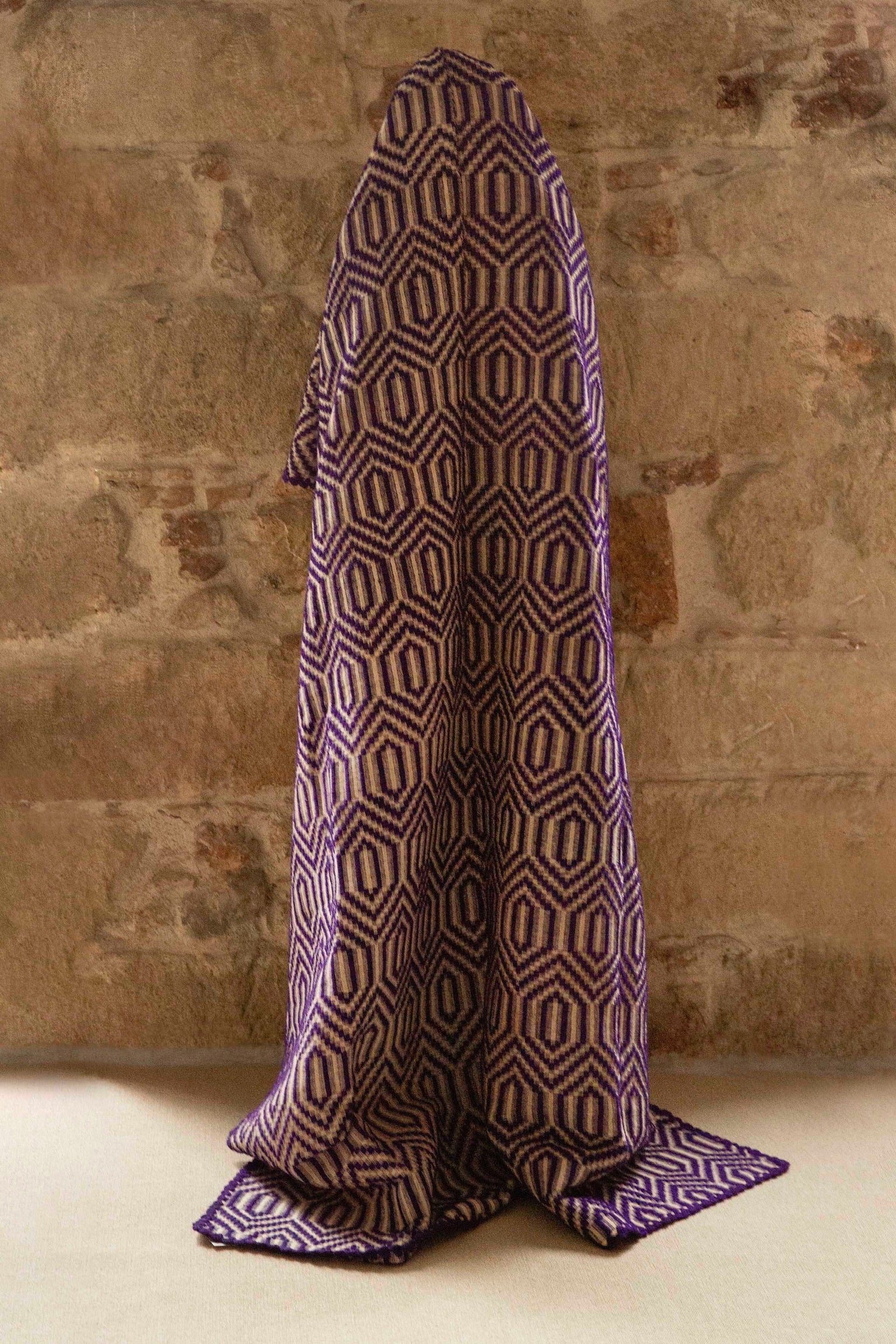 A handwoven Greek wool throw in deep plum with a repeating oval geometric motif. Graphic and architectural, Amvyli brings bold pattern and winter richness to any interior.