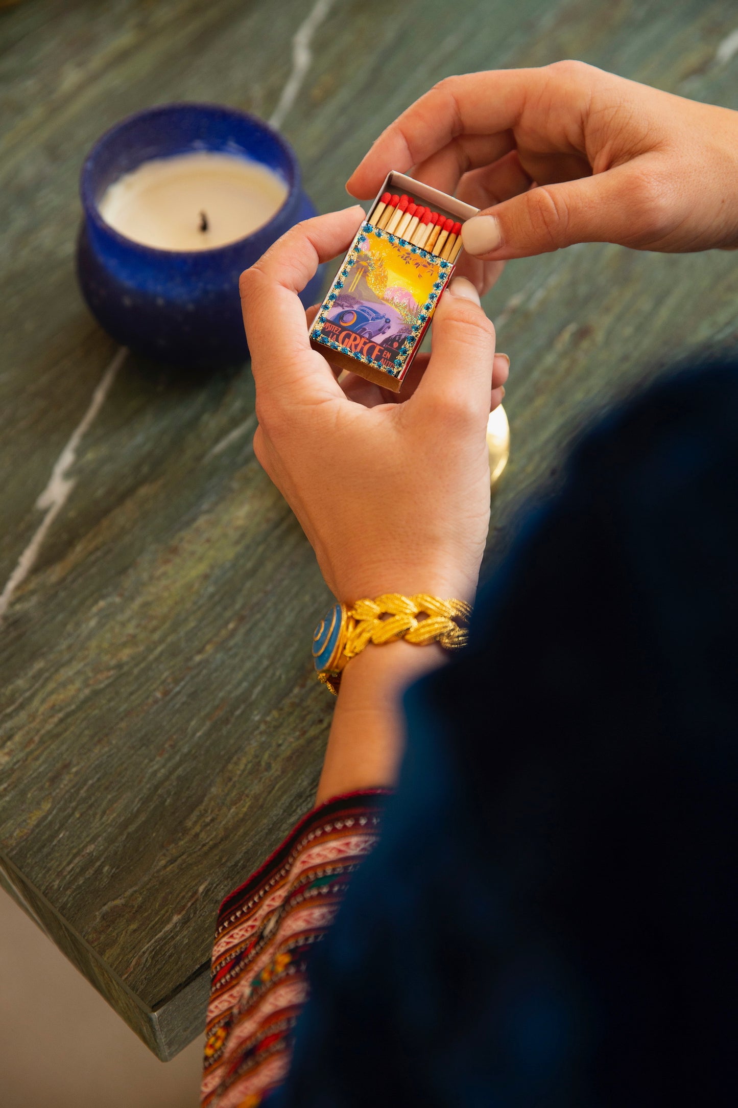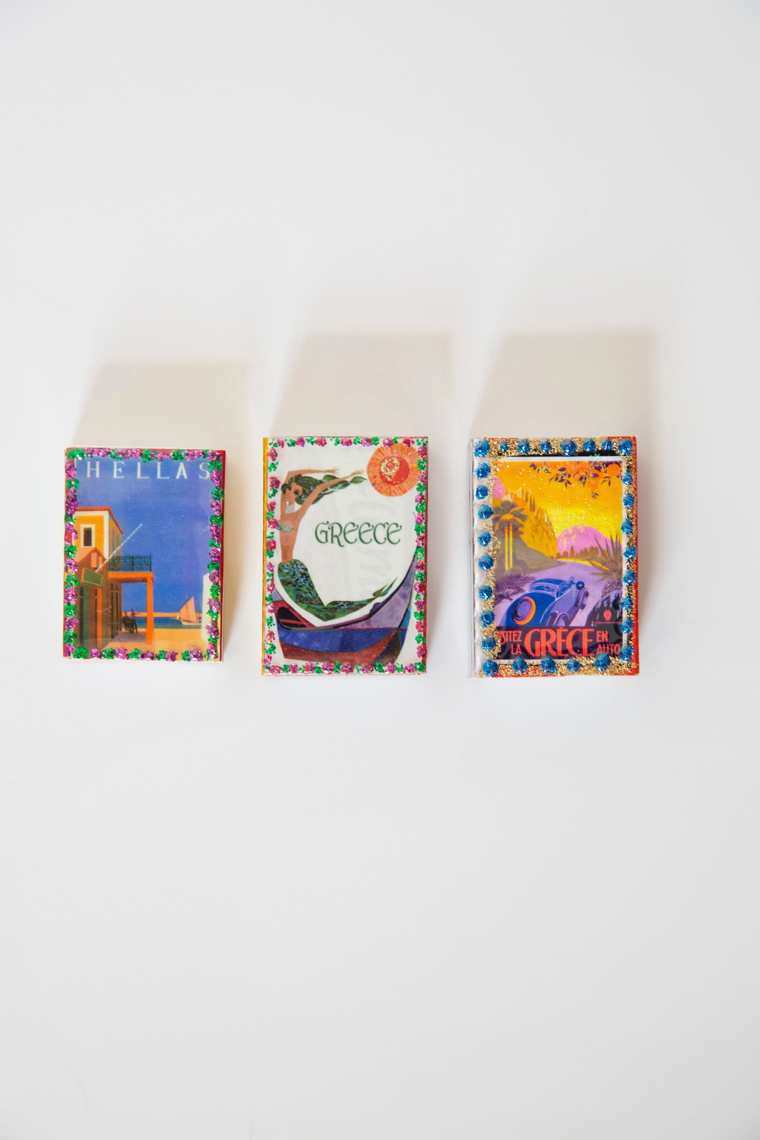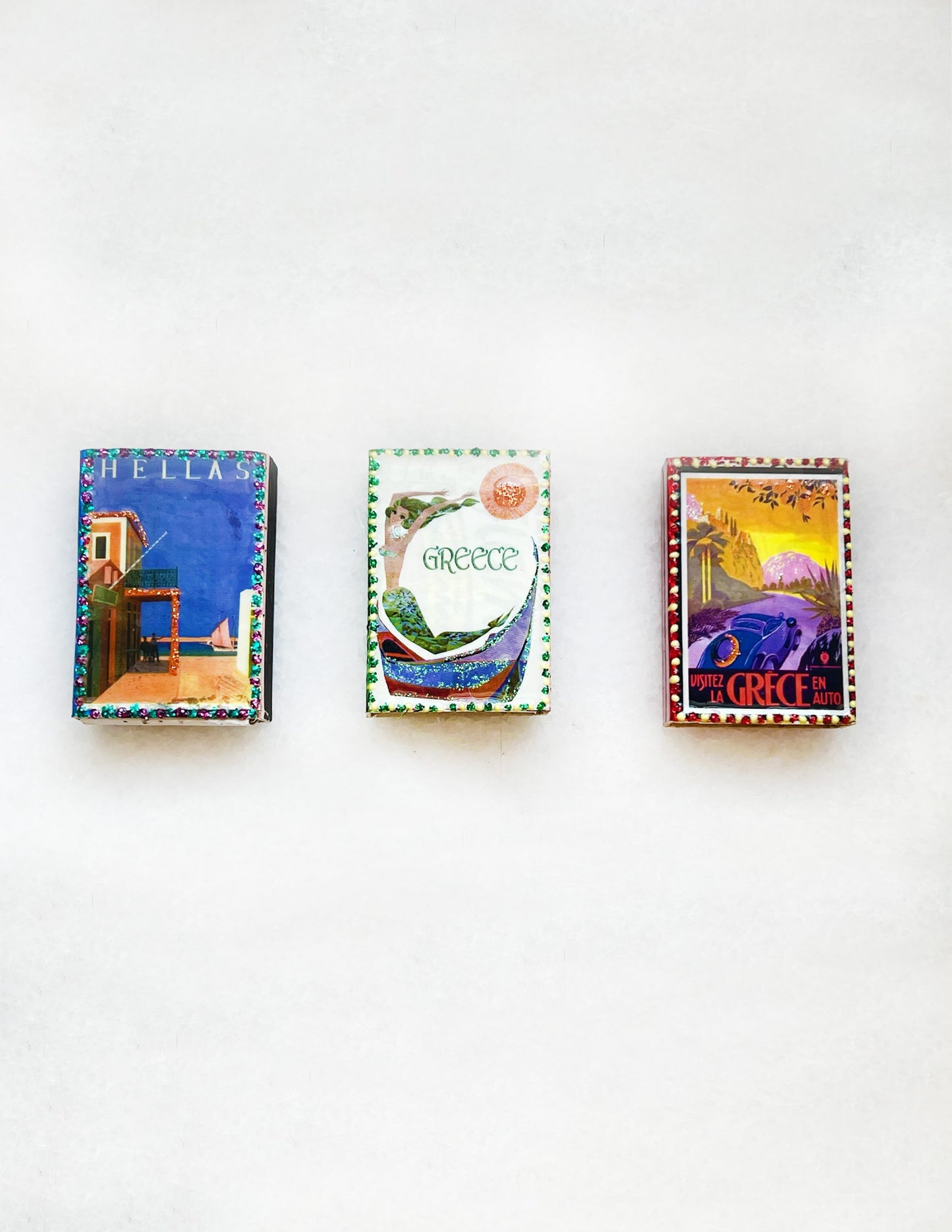 An avid matchbox collector, Andria designed and produced these matchboxes in Mexico City as part of our Merging Myths collection, where she worked with various artisans in Mexico to preserve various crafts and marry the cultures of the two countries. Created in a small factory, each is a piece of art utilizing traditional pop art method of matchbox decorating in Mexico, and embellished by hand with metallic paint around the edge and featuring a vintage travel poster of Greece, selected by Andria.