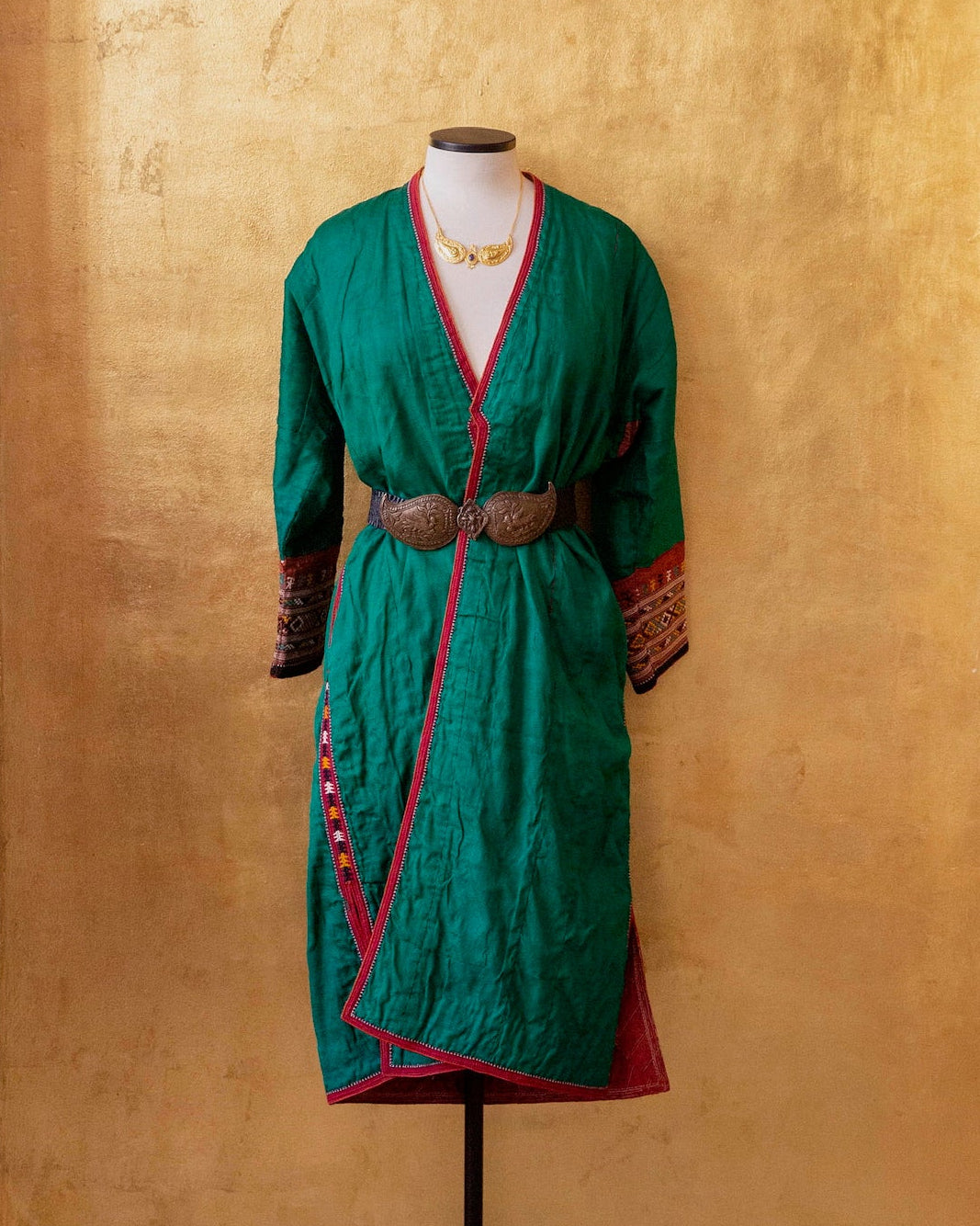 Personally sourced by Anthologist’s visionary founder, Andria, this rare gem transcends time. Its luxurious silk fabric drapes elegantly, while the hand-embroidered accents and cuffs showcase the exceptional skill of artisans who poured their heart and soul into creating this work of art.