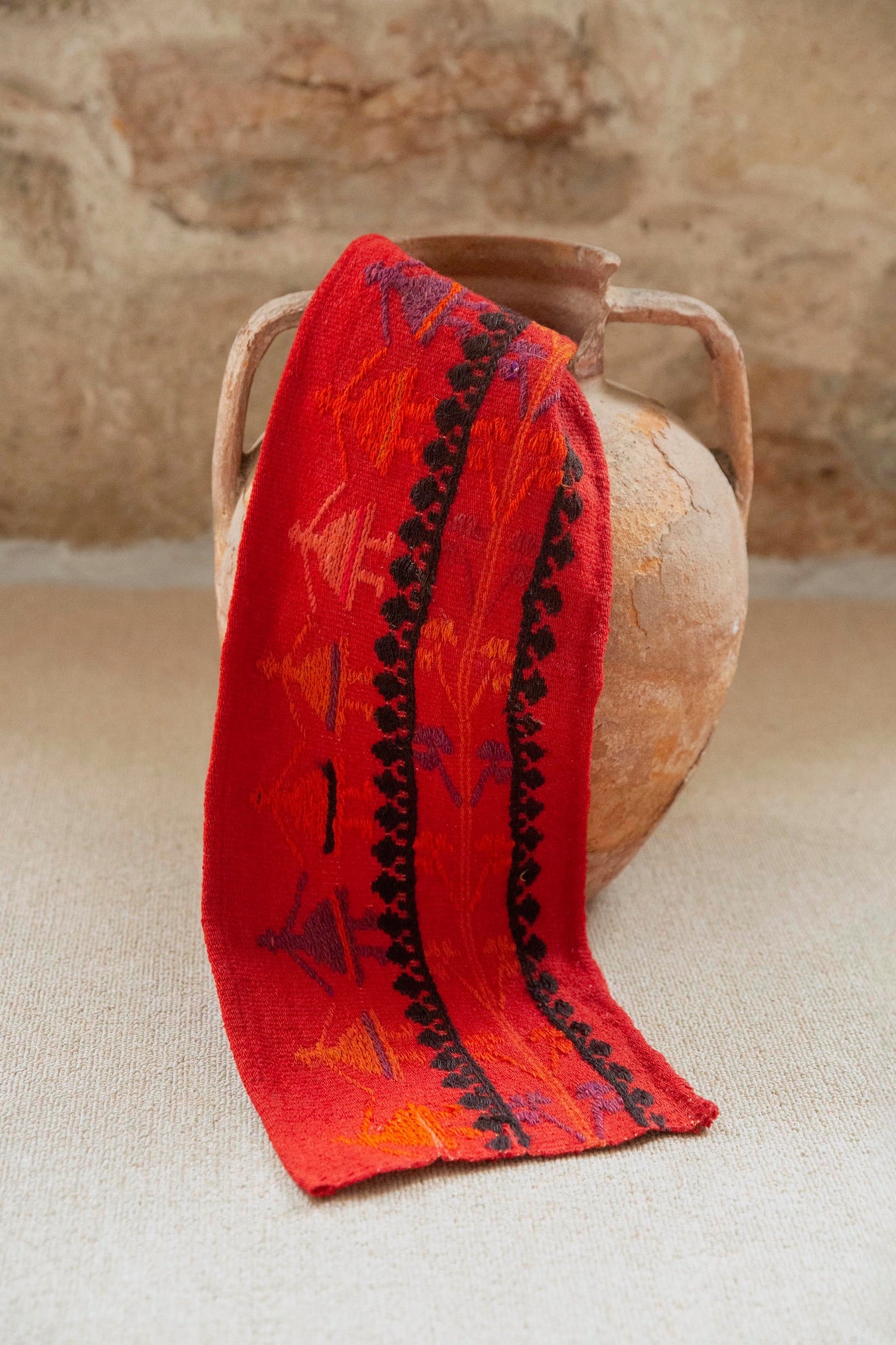 Choreístria is woven in vivid reds, oranges, and violets, its central band animated by a procession of female figures linked hand in hand. Their triangular skirts and uplifted arms create a rhythmic, almost musical pattern against the saturated wool field. Intimate in scale but powerful in presence, the piece reads like a fragment of a larger festive cloth—perfect draped or displayed vertically on a wall.