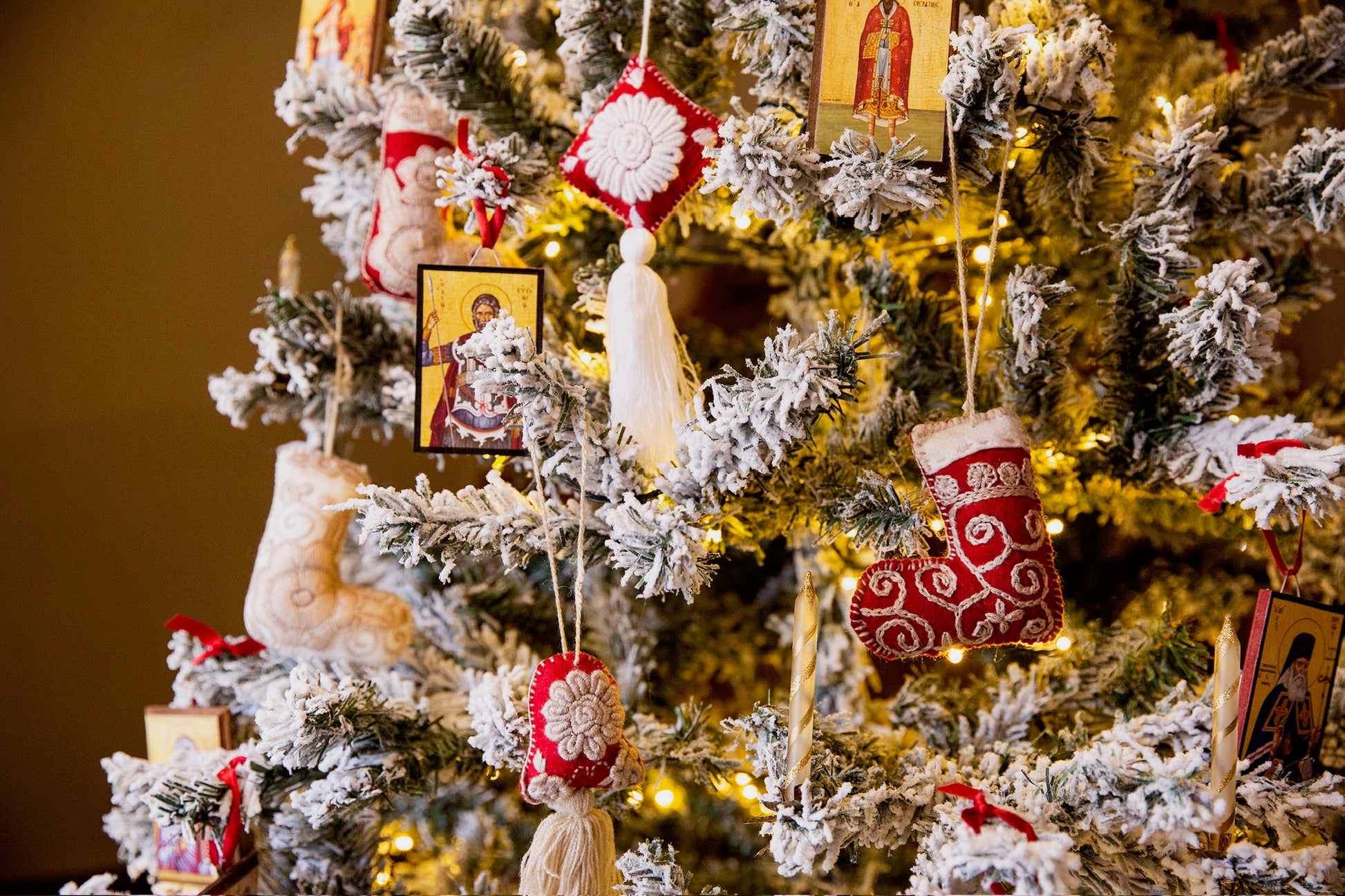 The set includes three embroidered felt boots — Floral Red, Natural Neutral, and Scroll Pattern — alongside two sculptural tassel ornaments in complementary floral and scroll motifs. Together, they create a quietly luxurious palette of crimson, ivory, and soft natural tones, designed to bring texture, story, and artisanal spirit to any tree, tablescape, or wrapped gift.