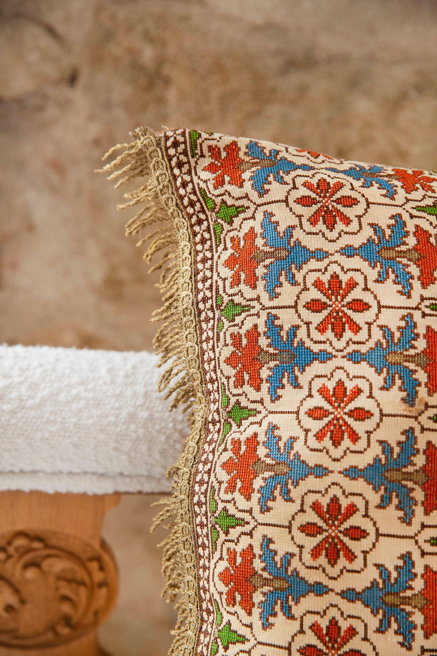 Intricately hand-embroidered in tones of russet, pomegranate, olive, and deep indigo, Karpos is a celebration of the Greek harvest season. Inspired by traditional floral and vine motifs found in Byzantine tiles and village embroidery, the design carries both ornamental beauty and rustic soul.