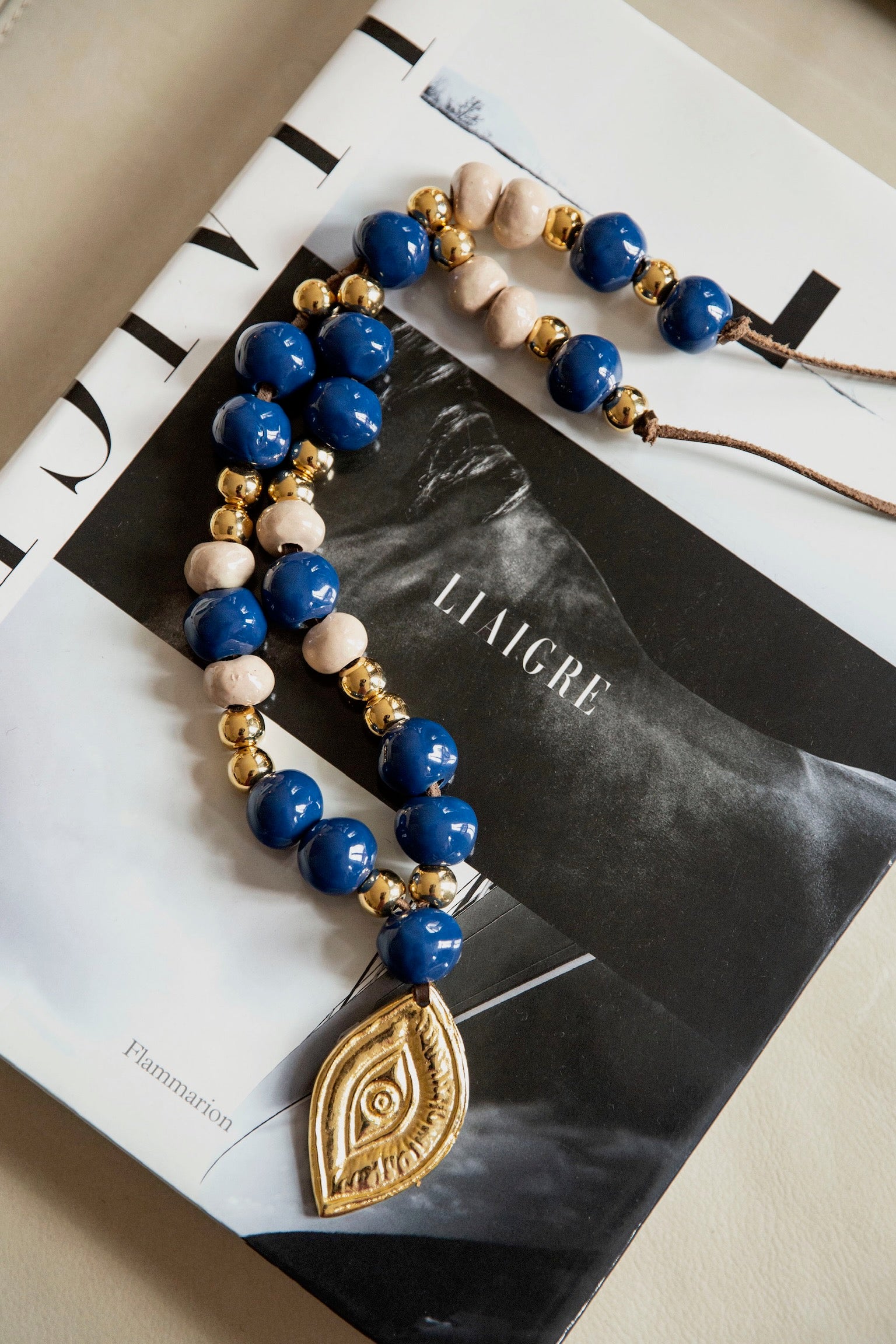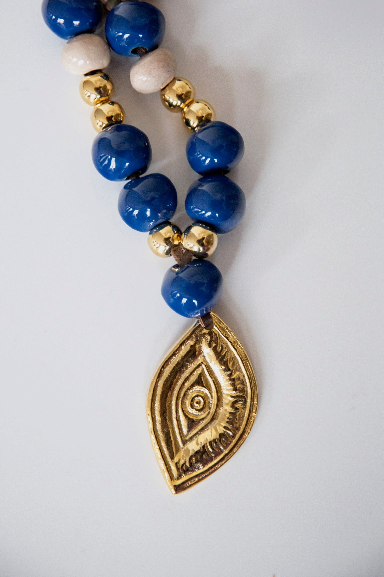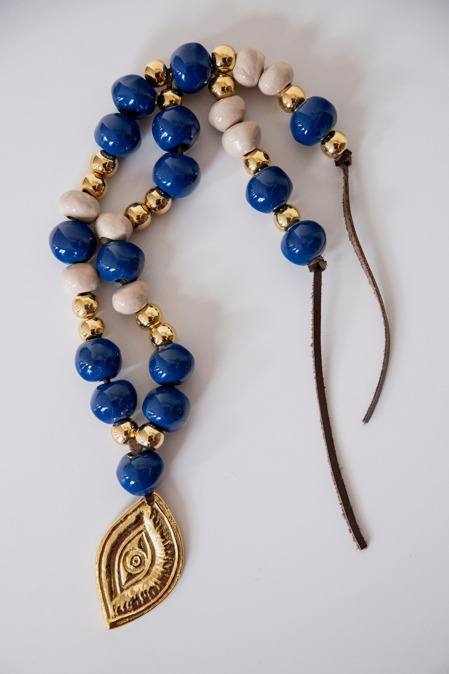 The komboloi can traditionally be seen used by Greek men in the kafeneio or coffee shop, to while away time, and tension. Vintage glass beads are accented by solid brass beads, hand-strewn on leather cord, and accented by a solid brass mati (evil eye) to ward off evil spirits.