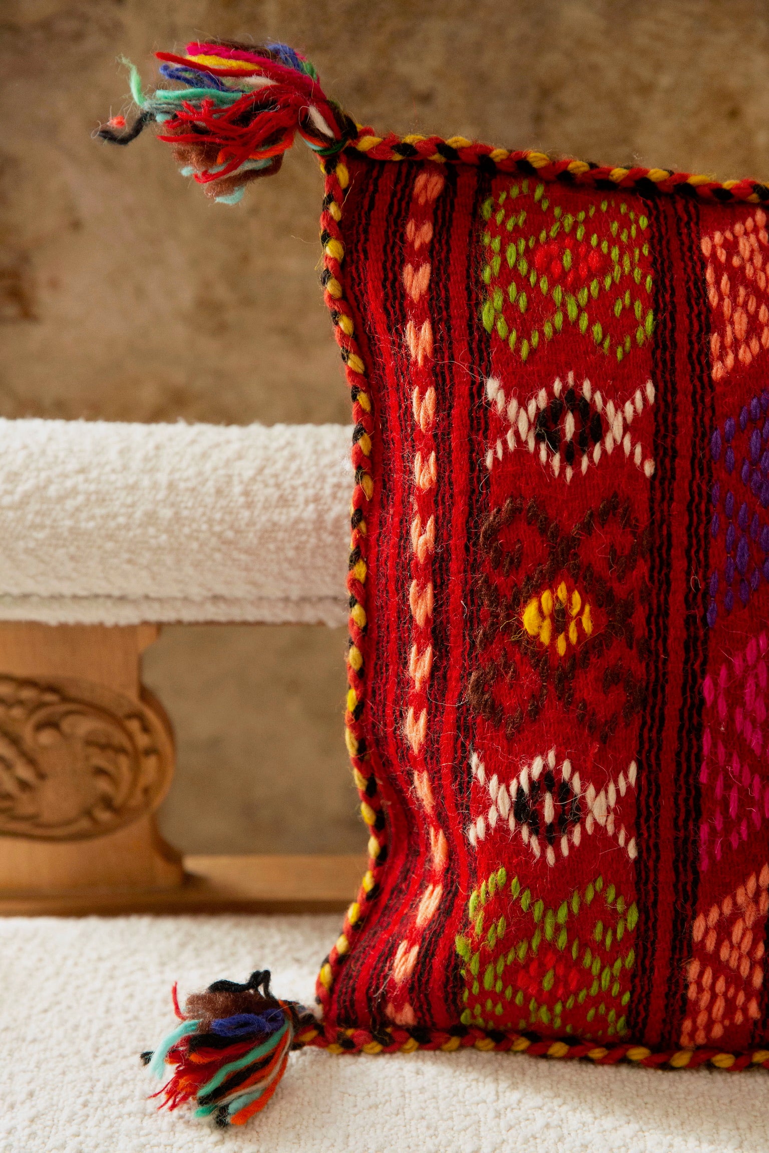 A handwoven wool pillow in radiant winter hues—saffron, crimson, plum, and marigold—inspired by northern Greek mountain textiles. Its geometric bands and tasseled corners reflect ancestral weaving traditions, bringing color, warmth, and celebratory energy to any room.