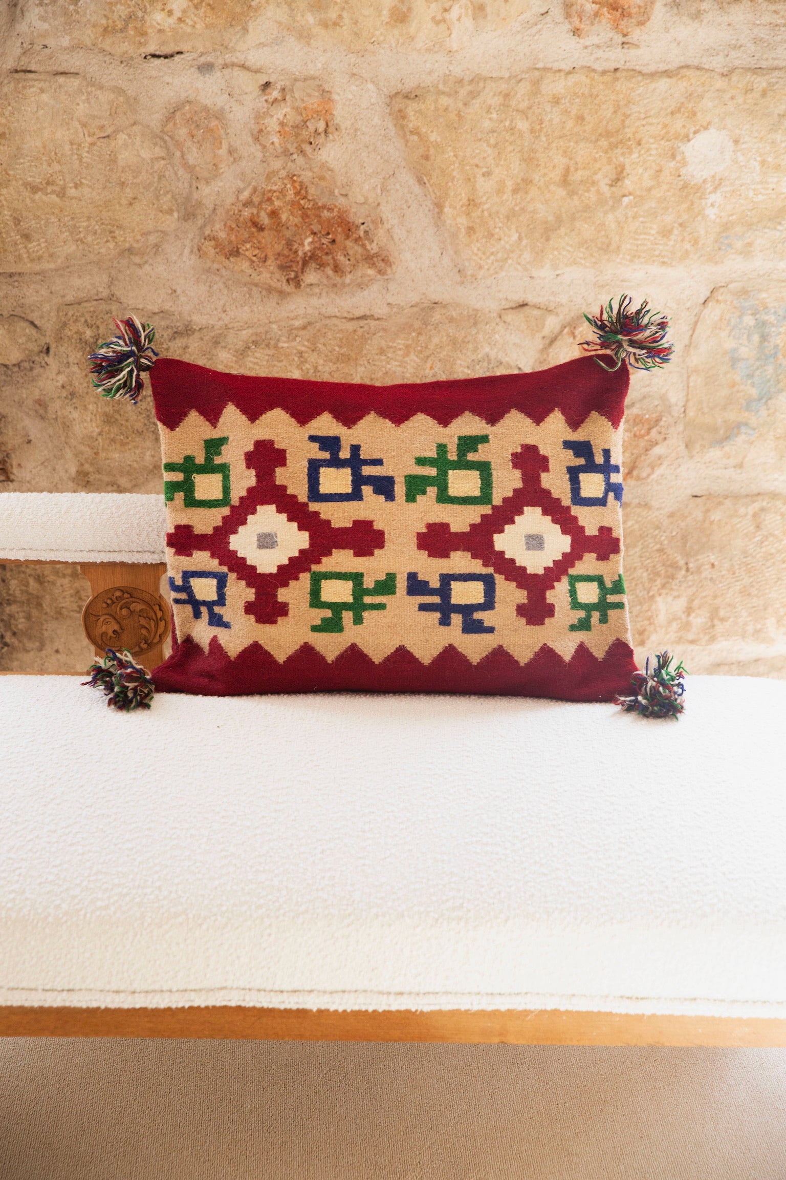 Steeped in tradition and handcrafted with intention, trio hails from Lagadia, Arkadia, Greece—a village renowned for its masterful weavers and rich textile heritage. Every thread, meticulously handwoven, carries the soul of its maker, a testament to the enduring artistry of Greek craftsmanship.The bold geometric patterns, inspired by ancient Hellenic and Byzantine motifs, create a rhythmic balance of deep burgundy, rich navy blue, earthy green, and soft ivory—a palette that feels both timeless and modern. The tasseled corners add an unexpected touch of whimsy, reinforcing the artisanal nature of each piece.