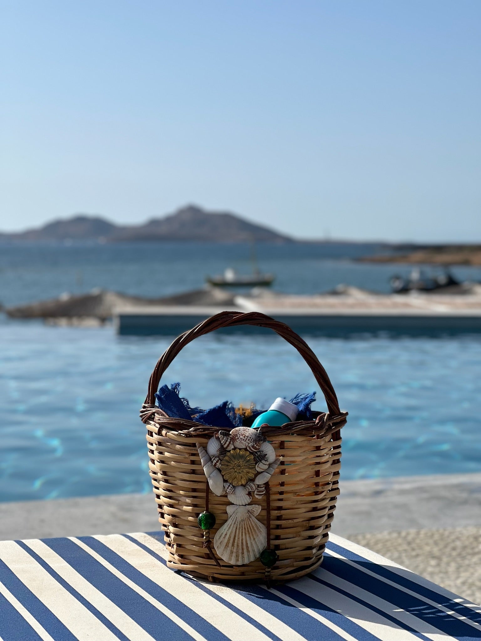 Channel your inner Jane Birkin with the Anthologist basket bag, woven on the island of Paros by local artisans, with hand-crafted embellishments applied by Anthologist’s founder. Each basket is tied with leather cord, accented by vintage brass and glass beads, punctuated by seashells found on Parian beaches.