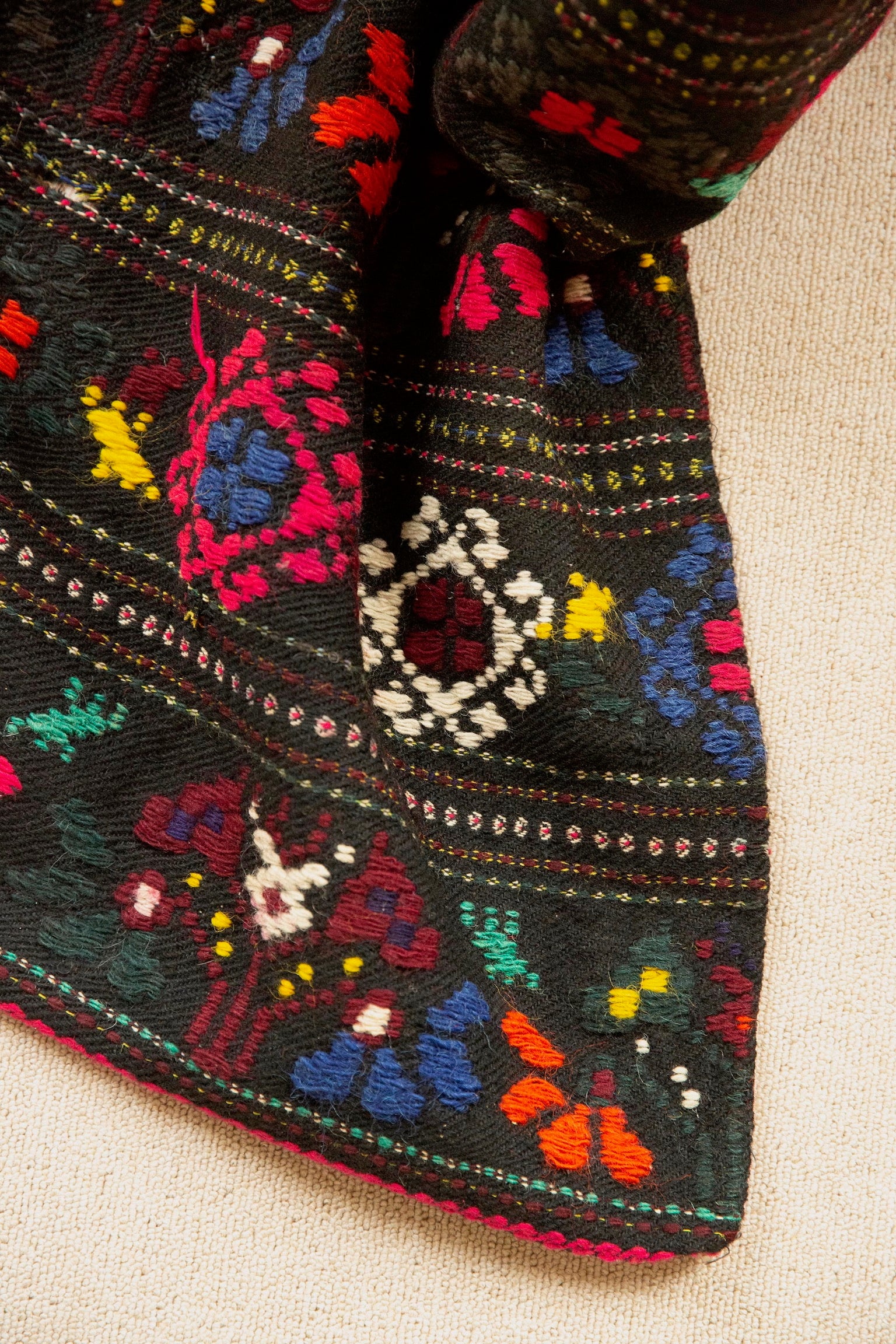 Polychroníon is a celebration of color—a dense, handwoven field of midnight wool punctuated by embroidered symbols in fuchsia, emerald, sapphire, citron, and flame red. Small mirrored elements catch the light, lending the piece an almost ceremonial presence. Draped over a sofa or hung as a vertical panel, it becomes a textured tapestry of movement and memory.