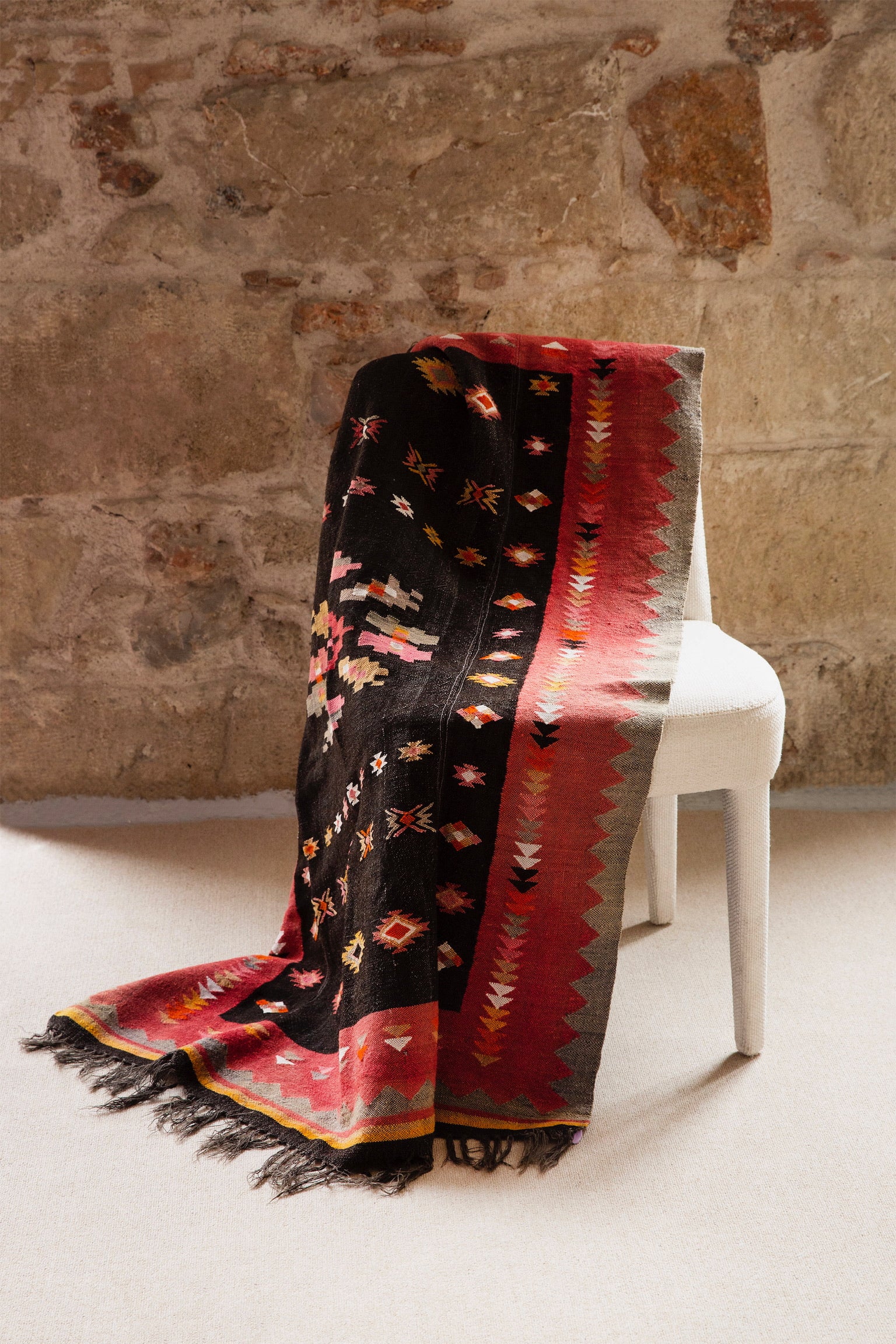 A handwoven wool throw in deep black softened by bands of rose, clay, and ash-grey, punctuated with small geometric emblems reminiscent of winter fields and mountain weaving traditions. With its subtle palette and fringe finish, Stáchy feels both rustic and refined, ideal draped across a chair or layered as a seasonal accent.