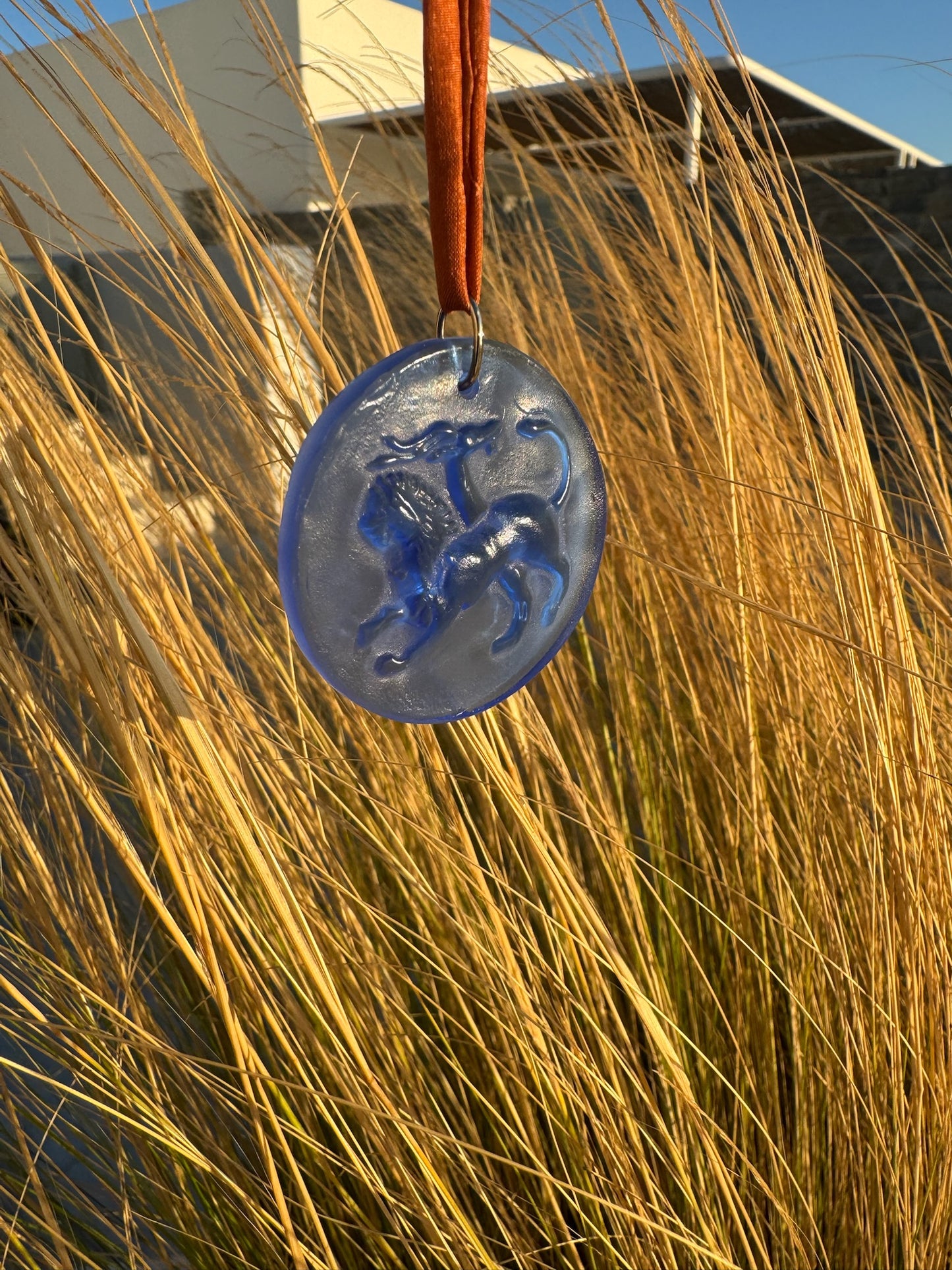 This edition of the Chimera Medallion is born of fire and breath—hand-cast in Aegean blue Murano glass by Venetian artisans who preserve one of Italy’s most storied craft traditions. The Chimera—our symbol of complexity, myth, and metamorphosis—is sculpted in relief within the glass, a shimmering echo of ancient forms interpreted through a modern lens.