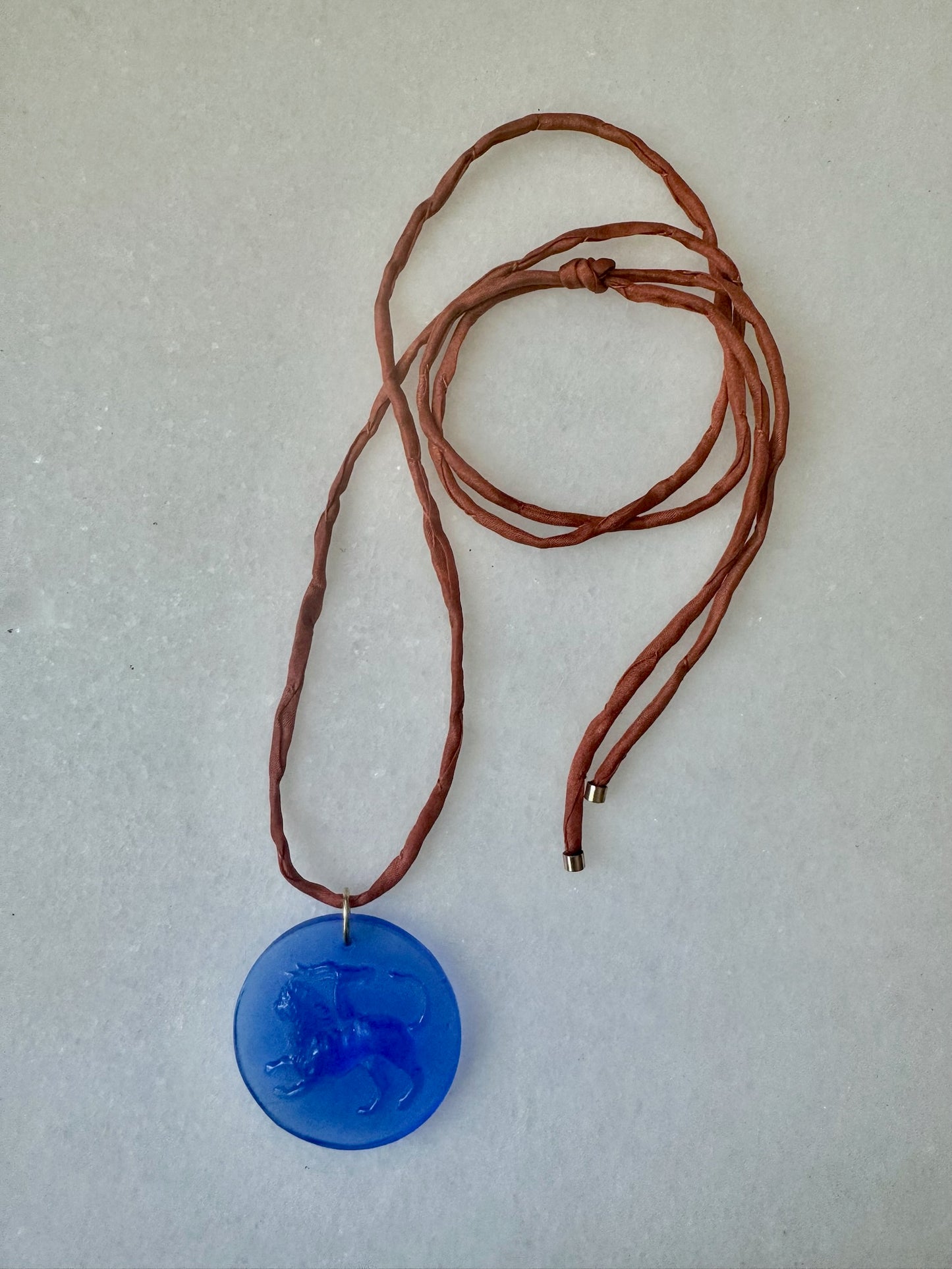 Materials: Aegean Blue Murano Glass, 18k Yellow or White Gold, Silk Cord