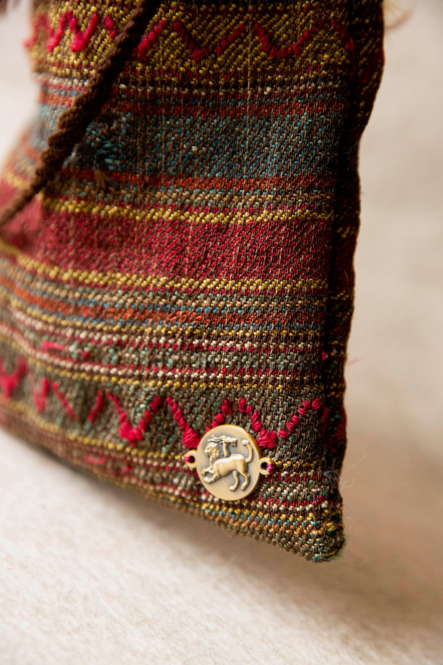 - Details: Mini fringed kilim bag, brass buckle strap. Vintage handwoven tagari with Italian leather Red strap