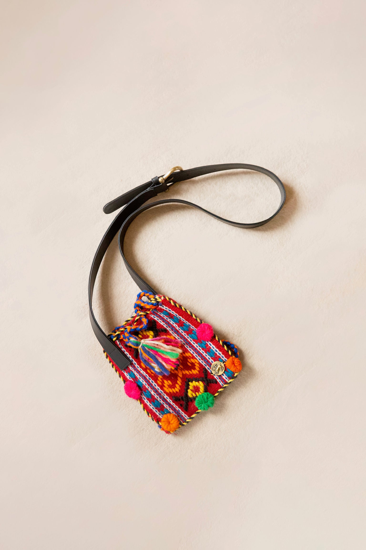 - Details: Mini folk Cretan Textile embroidered bag with pom details, brass buckle strap. Vintage handwoven tagari with Italian leather black strap and solid brass buckle