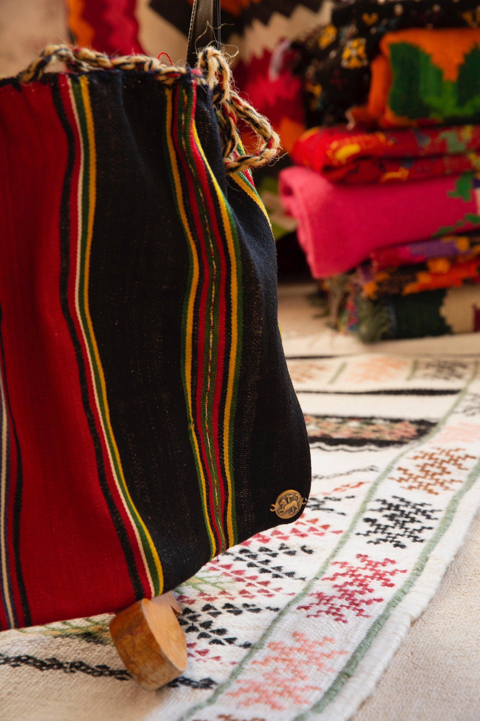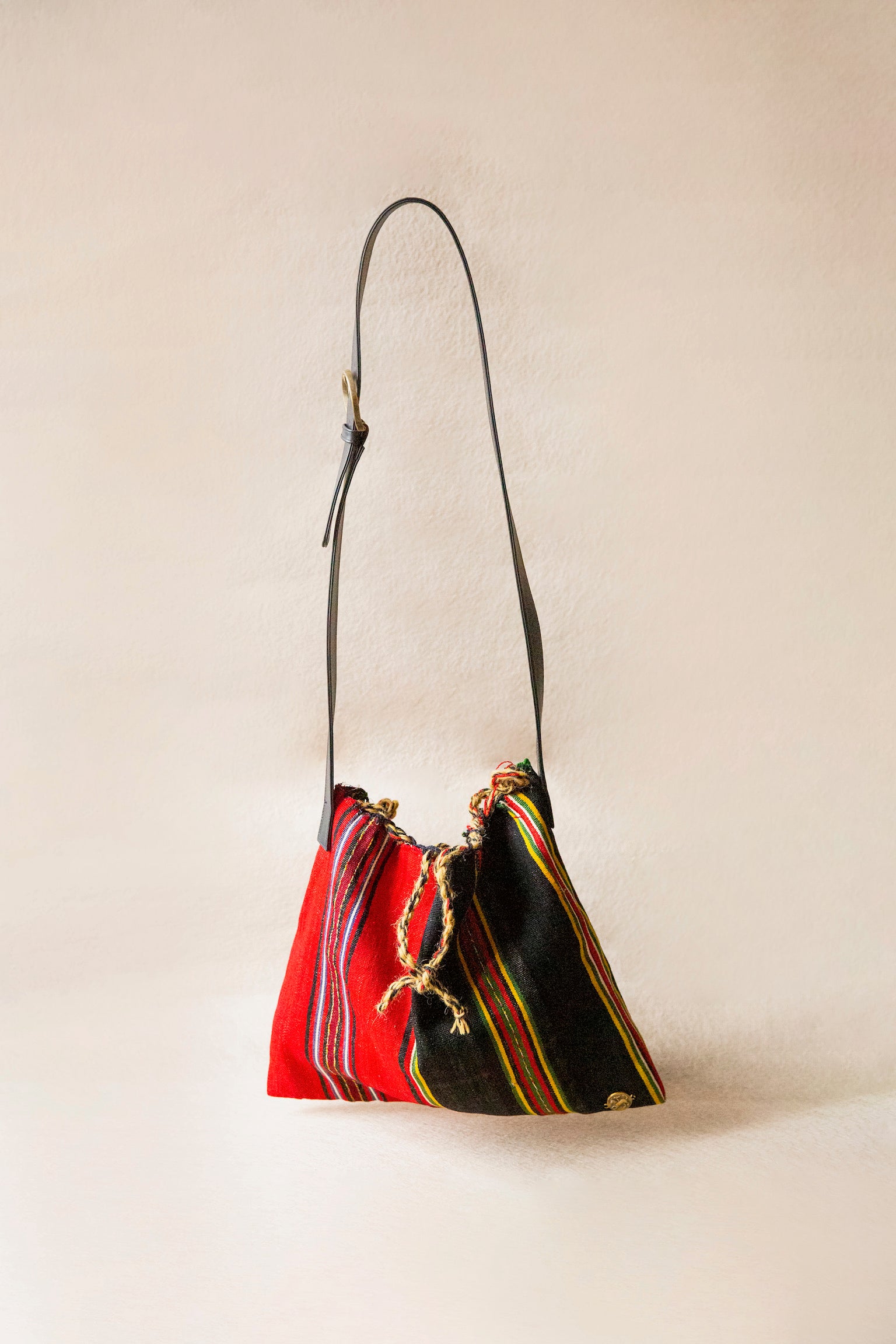 - Details: Woven vertical stripe flat‑weave bag, brass buckle strap. Vintage handwoven tagari with Italian leather black strap and solid brass buckle