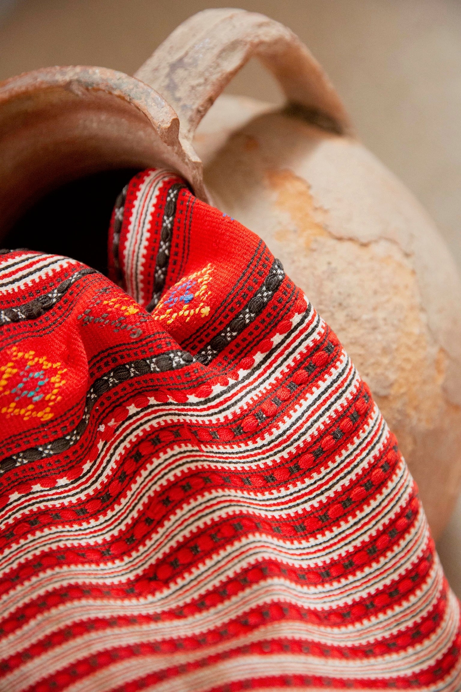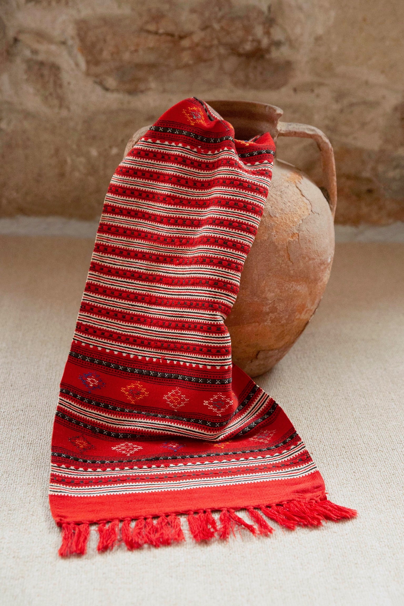 Zōstárion is a vibrant red runner woven with bands of black, cream, and deep plum patterns that feel both festive and deeply rooted in folk tradition. The hand-twisted fringe adds a soft finish, making it ideal for a winter table, a console, or layered atop a textile vignette. Its structure is clean and graphic, yet it carries the warmth of something crafted slowly and with intention.